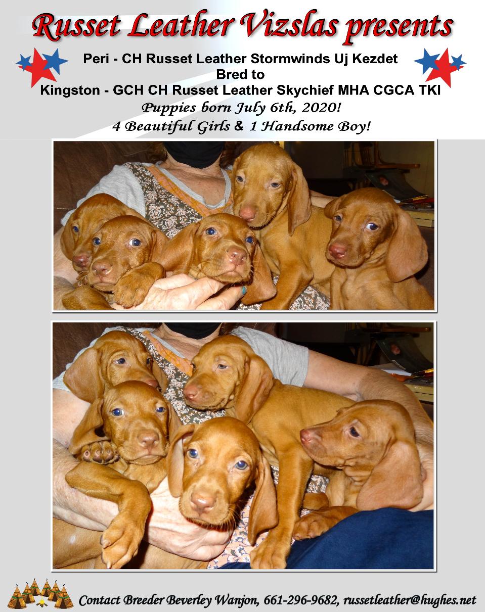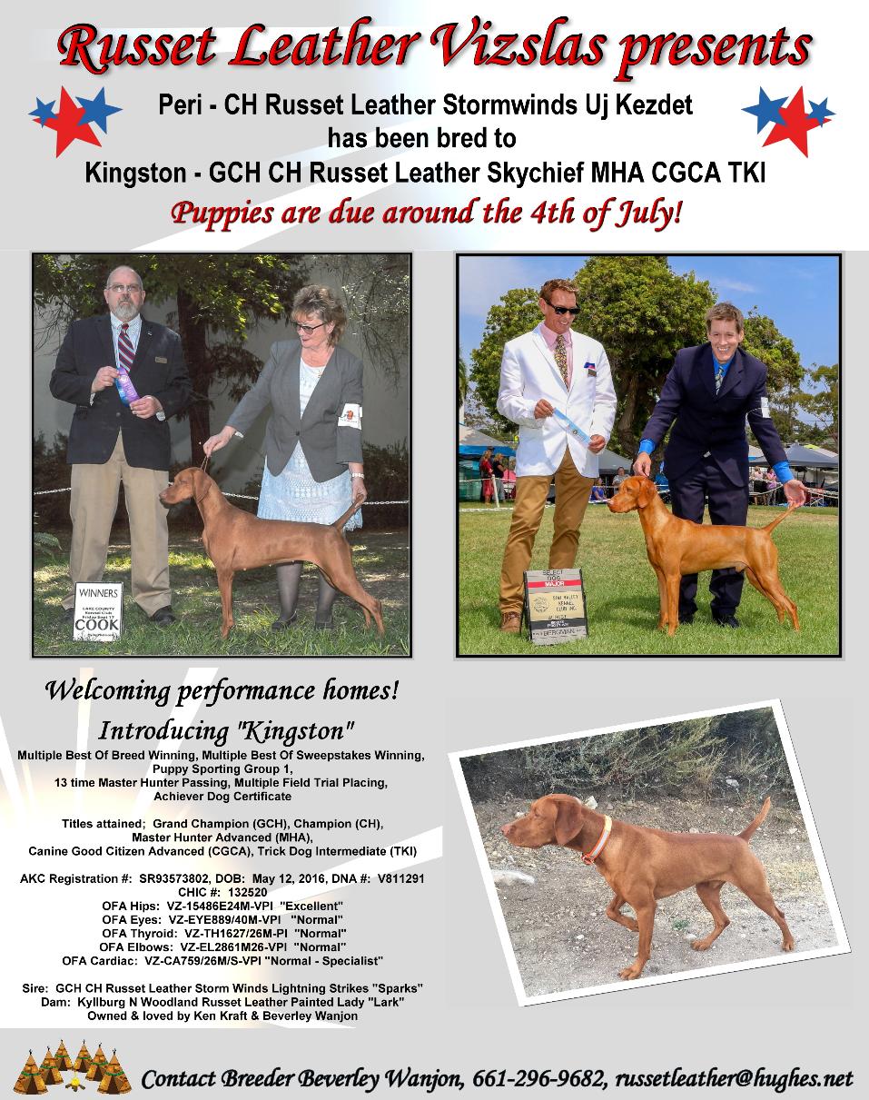 | Peri - CH Russet Leather Stormwinds Uj Kezdet Bred By Exhibitor Winning Titled attained; Champion (CH) AKC Registraton #: SR87914501 DOB: April 16, 2015 OFA Hips: VZ-15911F47F-VPI "FAIR" Sire: NBISS MBISS GCH CH Plaza's Save The Last Dance JH "Hummer" Dam: CH Storm Winds Ayenwatha "Maya" Breeders Kirsten Davis "Storm Wind Vizslas" and Beverley Wanjon "Russet Leather Vizslas" Owned & loved by Beverley Wanjon "Russet Leather Vizslas", Barry Golob, William Davis and Judy Saddlemire bred to Kingston - GCH CH Russet Leather Skychief MHA, CGCA, TKI Multiple Best Of Breed Winning, Multiple Best Of Sweepstakes Winning, Puppy Sporting Group 1, 13 time Master Hunter Passing, Multiple Field Trial Placing, Achiever Dog Certificate Titles attained; Grand Champion (GCH), Champion (CH), Master Hunter Advanced (MHA), Canine Good Citizen Advanced (CGCA), Trick Dog Intermediate (TKI) AKC Registration #: SR93573802 DOB: May 12, 2016 DNA #: V811291 CHIC #: 132520 OFA Hips: VZ-15486E24M-VPI "EXCELLENT" OFA Eyes: VZ-EYE889/40M-VPI "NORMAL" OFA Thyroid: VZ-TH1627/26M-PI "NORMAL" OFA Elbows: VZ-EL2861M26-VPI "NORMAL" OFA Cardiac: VZ-CA759/26M/S-VPI "NORMAL - SPECIALIST" Sire: GCH CH Russet Leather Storm Winds Lightning Strikes "Sparks" Dam: Kyllburg N Woodland Russet Leather Painted Lady "Lark" Breeder Beverley Wanjon "Russet Leather Vizslas" Owned & loved by Ken Kraft & Beverley Wanjon "Russet Leather Vizslas" Breeder Beverley Wanjon "Russet Leather Vizslas" Puppies whelped 07/06/2020! Puppy Photo Album Peri x Kingston Picture 4 Generation Pedigree Peri x Kingston Printable 4 Generation Pedigree |