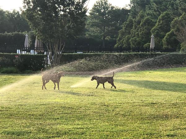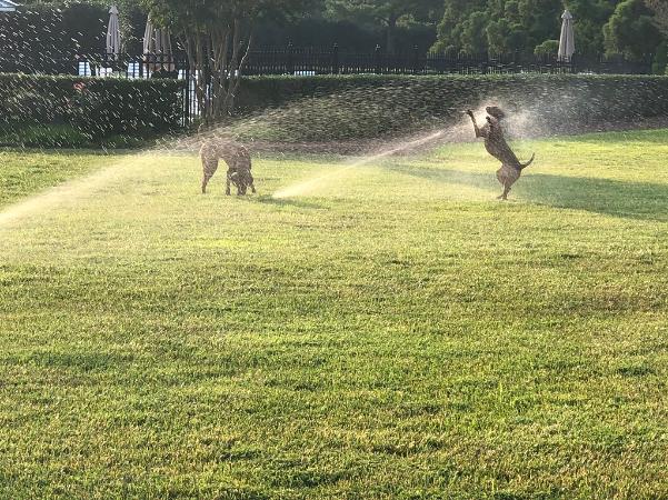 | Duke & Belle enjoying the sprinklers! Guess which one is Belle?! |