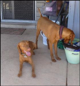 | Play Date @ Serenity Vizslas 04/02/2011 Sisters Patchouli (black collar) & Sophie (purple collar) |
