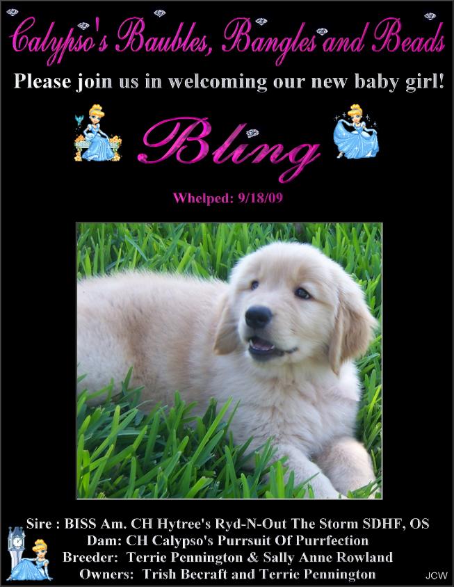 | Our little Princess! Bling - Calypso's Baubles Bangles And Beads AKC#: SR59666002 DOB: 09/18/2009 Breeders: Terrie Pennington & Sally Anne Rowland Loved & Owned By: Trish Becraft & Terrie Pennington Pedigree |